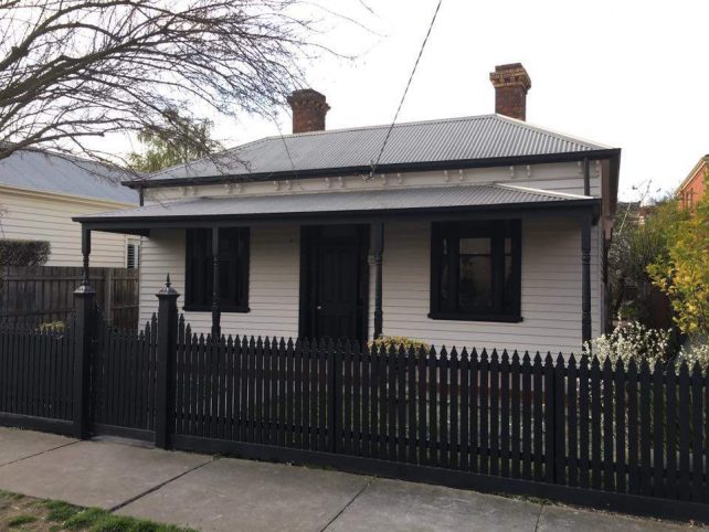 Black picket fence in front of a white weatherboard house with black trims and roof.