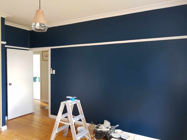 Navy blue wall with white trims, timber flooring and pendant light hanging from the ceiling.